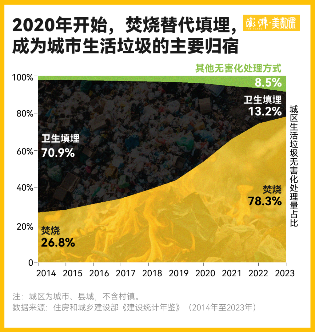 在西安灞桥江村沟垃圾填埋场封场的同一年,焚烧反超卫生填埋,成为国内城区生活垃圾的第一大处理方式。