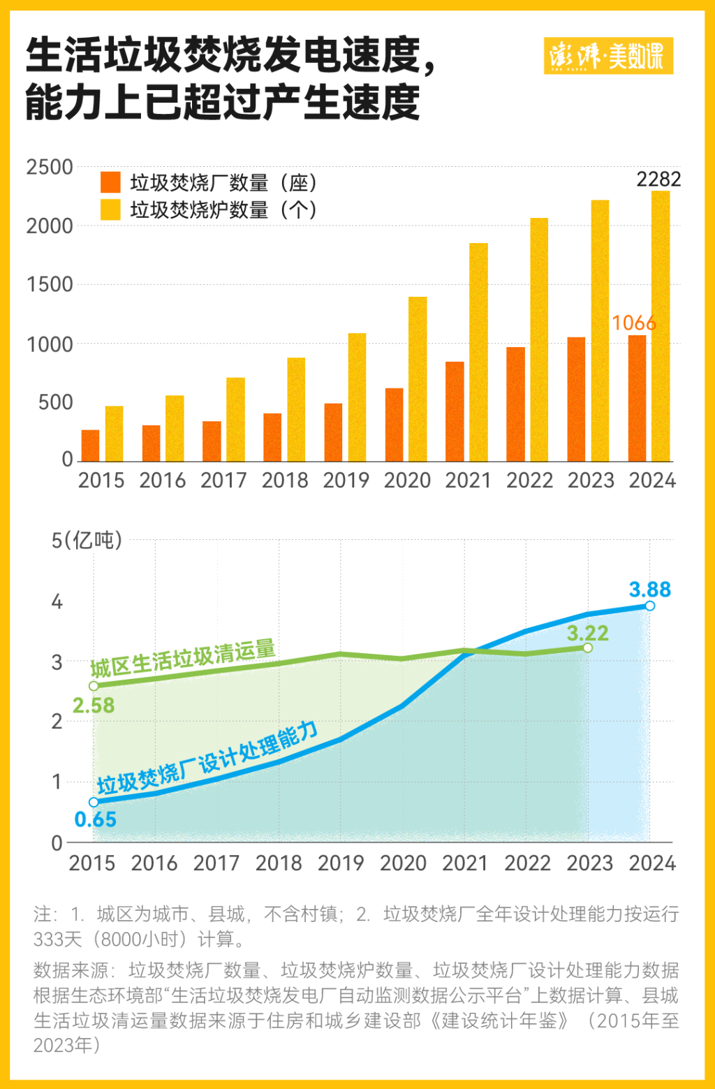 澎湃新闻梳理了焚烧发电厂监测平台上公布的国内各个在运营垃圾焚烧厂的垃圾焚烧炉设计处理能力,从2016年的每天能处理23.8万吨增长到了2024年的116.6万吨。如果按照住建部颁发的城市生活垃圾焚烧处理工程项目建设标准中规定的,垃圾焚烧炉的理想年运行小时数为8000小时(约为333天次)计算,那截至2024年年底,国内垃圾焚烧设计能力已达到了3.88亿吨一年,超过了城区生活垃圾的清运量。
