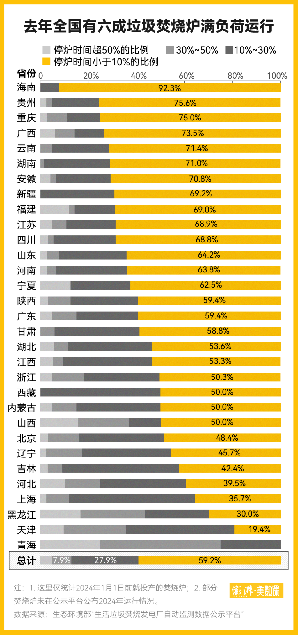 澎湃新闻梳理了焚烧发电厂监测平台上2138座垃圾焚烧炉2024年的运转情况,其中有1267座正常运转时间超过了全年的90%,比例为59.2%。