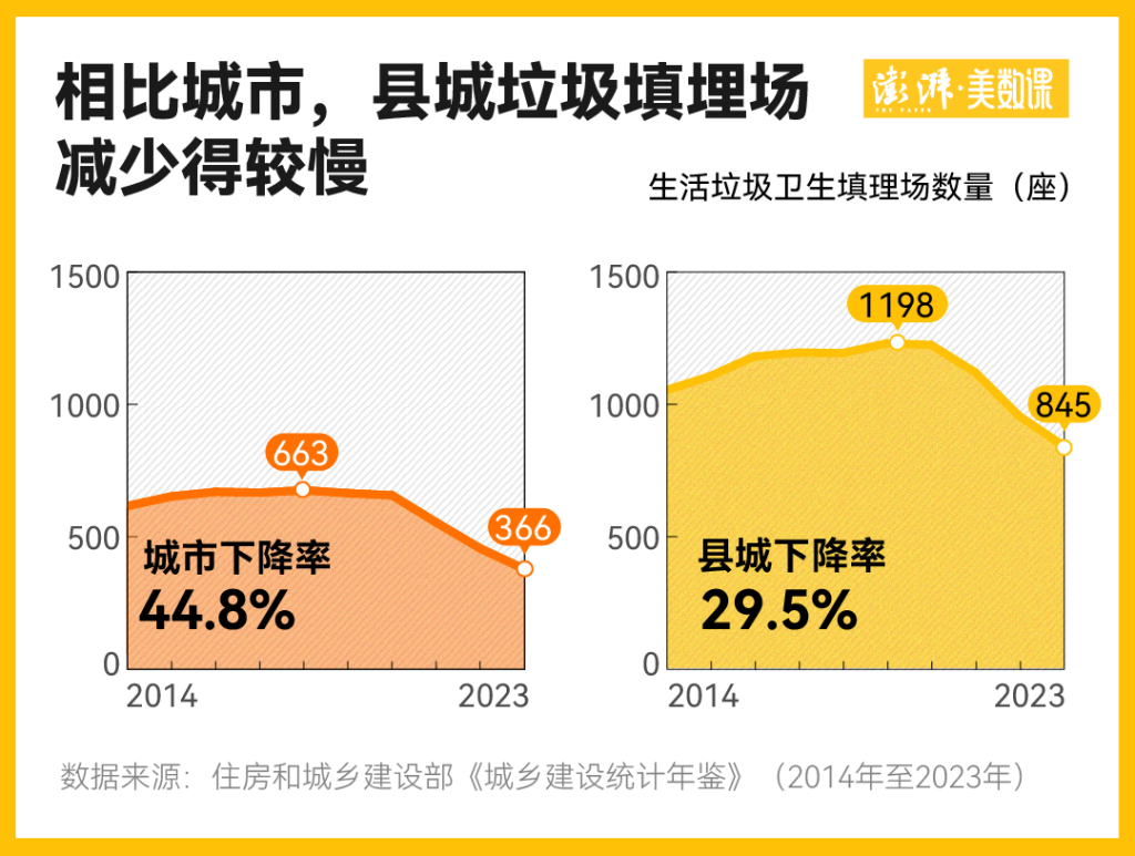 因此,我们能看到,相比城市的生活垃圾卫生填埋场自巅峰的663座下降到366座,降幅达到44.8%,县城的降幅要小很多,为29.5%。