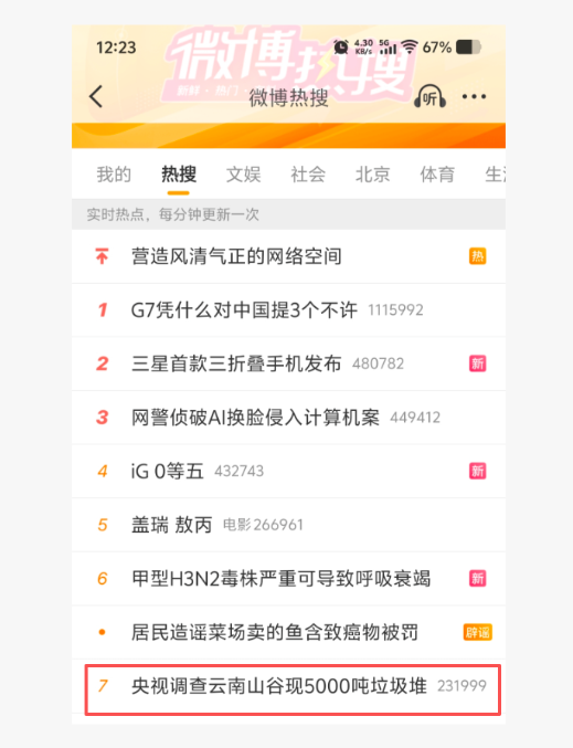 12月2日,“央视调查云南山谷现5000吨垃圾堆”登上微博热搜。事件源于11月28日,有网友在网络平台发布视频,曝光云南省普洱市澜沧拉祜族自治县竹塘乡一处山谷里被倾倒大量生活垃圾,总台记者实地探访垃圾倾倒现场,对此事件展开追踪报道。