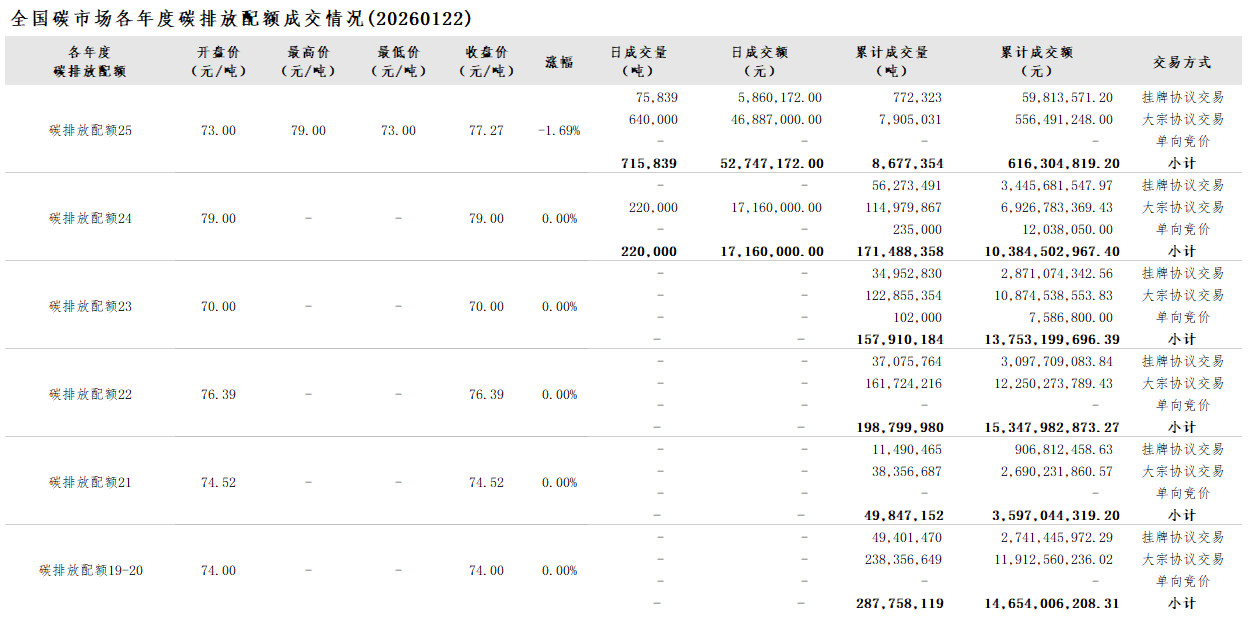 2026年1月1日至1月22日,全国碳市场碳排放配额成交量9,614,627吨,成交额690,422,652.20元。