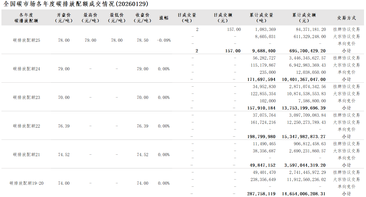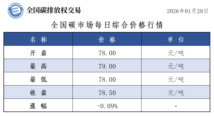 【CEA】全国碳市场每日综合价格行情及成交信息20260129