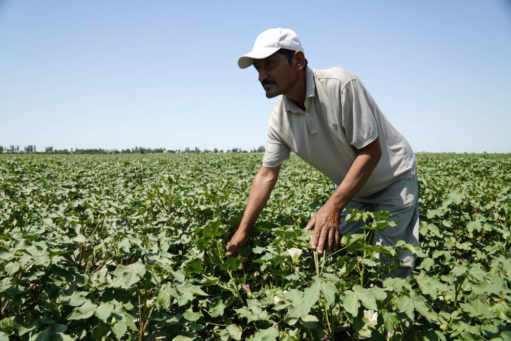 2024年7月28日,在乌兹别克斯坦锡尔河州的上合组织农业基地中乌现代农业科技示范园,棉农乌兹别科夫检查棉花种植情况。新华社发(扎法尔 摄)