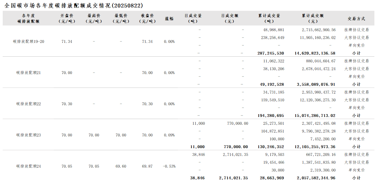 【CEA】全国碳市场每日综合价格行情及成交信息20250822