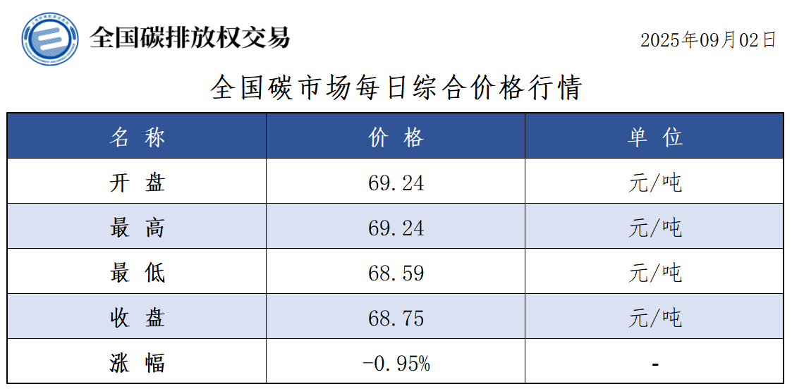 【CEA】全国碳市场每日综合价格行情及成交信息20250902