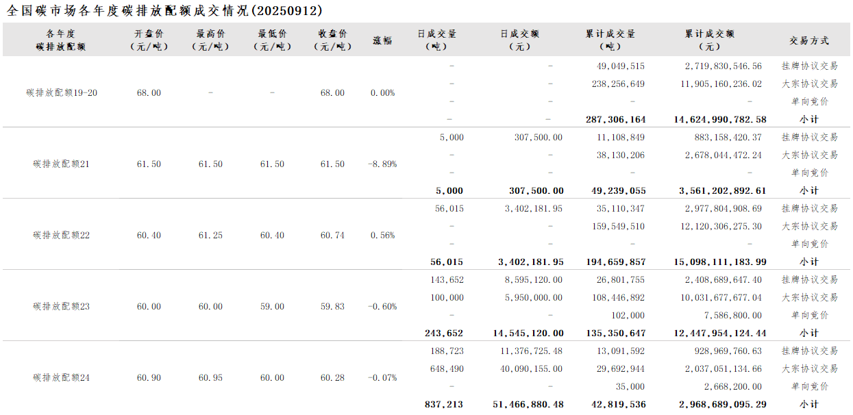 【CEA】全国碳市场每日综合价格行情及成交信息20250912