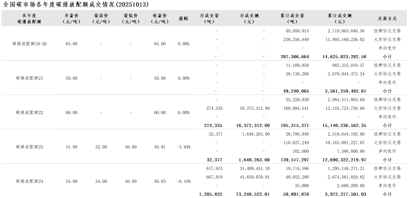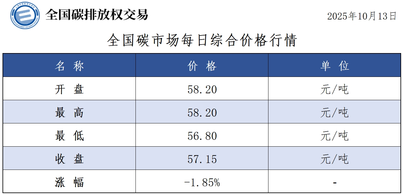 【CEA】全国碳市场每日综合价格行情及成交信息20251013