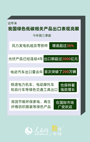 今年前三季度,风力发电机组及零部件增速超过30%;光伏产品已经连续4年出口额超过2000亿元;电动汽车出口量去年首次突破了200万辆……近年来,中国外贸企业积极顺应贸易绿色化趋势,将绿色低碳理念转化为优质产品,丰富了全球供给。一组数据,带你看中国外贸“向绿色”发展步伐加快。