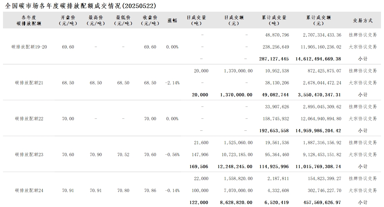 【CEA】全国碳市场每日综合价格行情及成交信息20250522