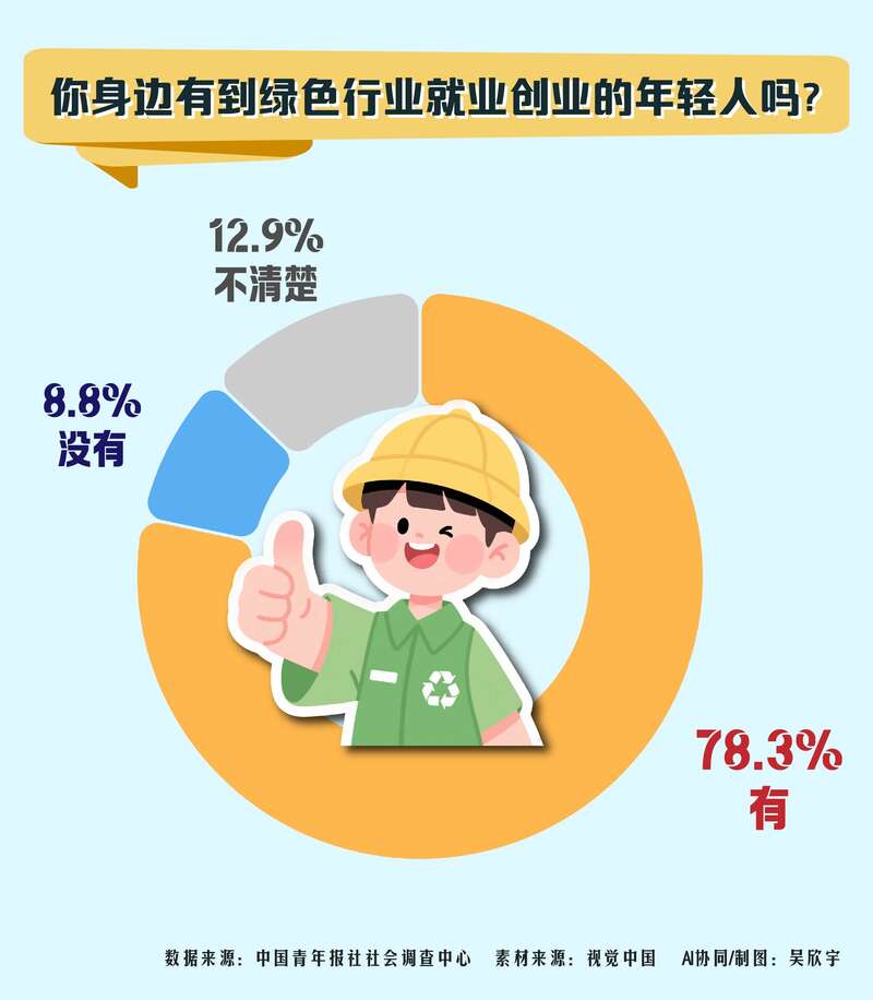 新能源汽车、光伏发电、绿色农业……我国经济的“含绿量”越来越高,也为年轻人提供了广阔的发展空间。在2025年世界青年发展论坛开幕前,中国青年报社社会调查中心联合问卷网,对1506名青年进行的一项调查显示,78.3%的受访青年表示身边有到绿色产业就业创业的年轻人。