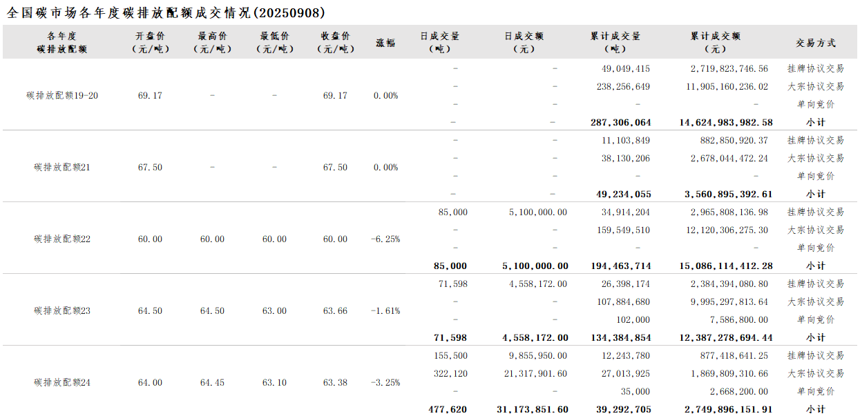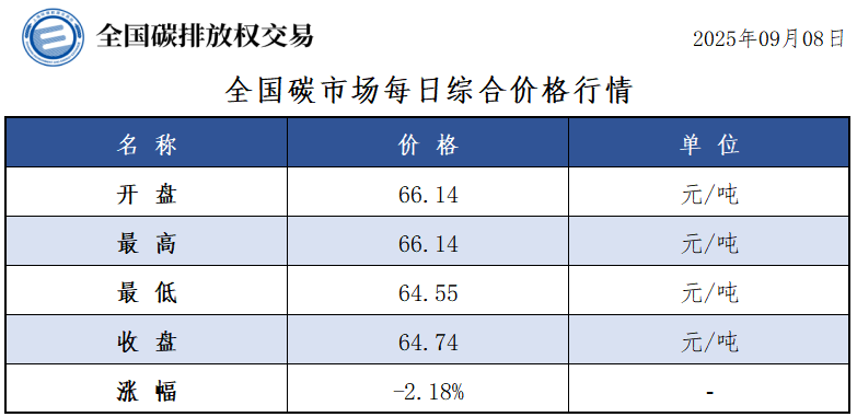 【CEA】全国碳市场每日综合价格行情及成交信息20250908
