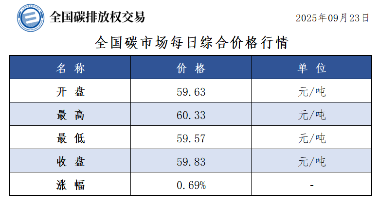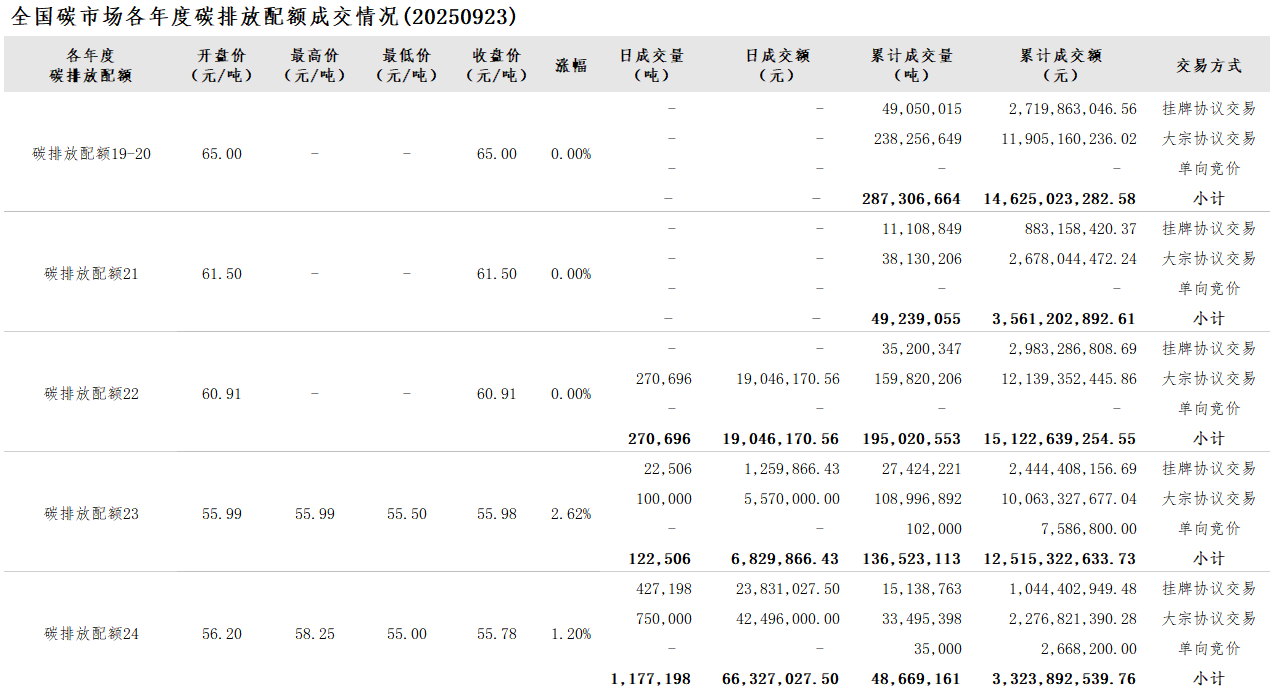 【CEA】全国碳市场每日综合价格行情及成交信息20250923