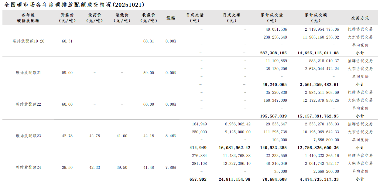 【CEA】全国碳市场每日综合价格行情及成交信息20251021