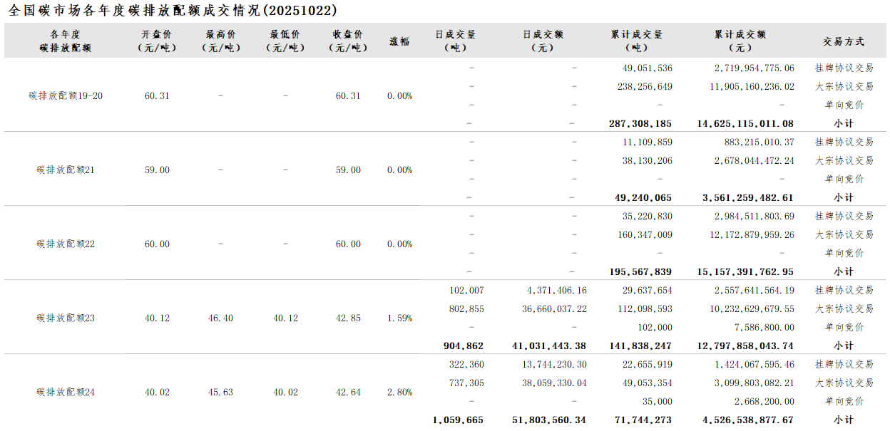 2025年1月1日至10月22日,全国碳市场碳排放配额成交量115,429,945吨,成交额7,635,436,074.54元。