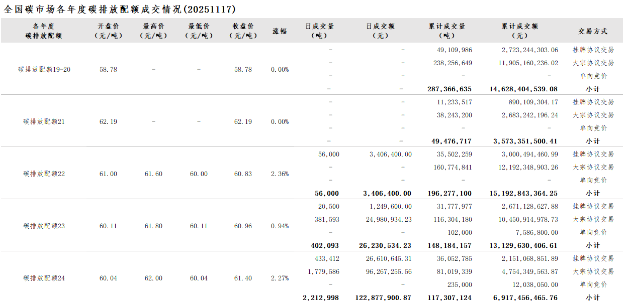 【CEA】全国碳市场每日综合价格行情及成交信息20251117