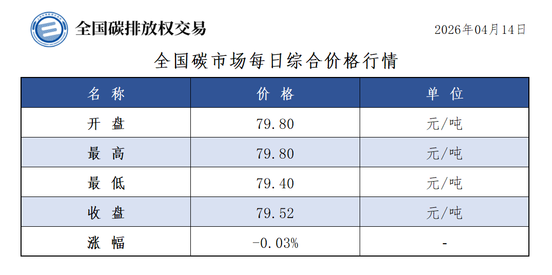 【CEA】全国碳市场每日综合价格行情及成交信息20260414