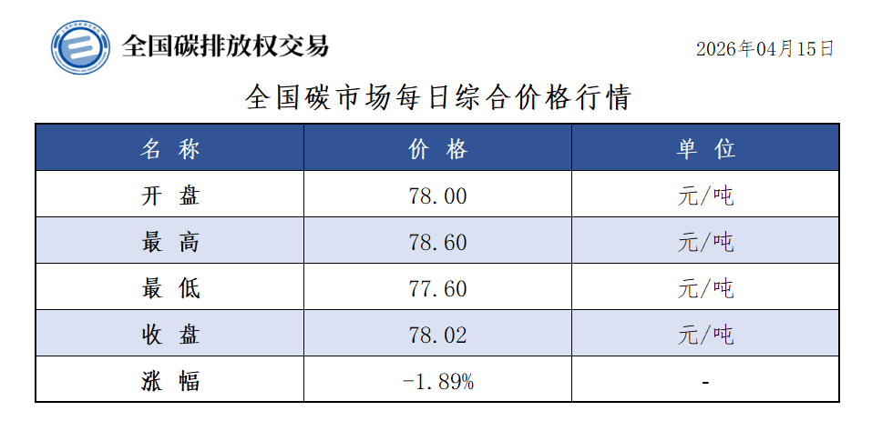 【CEA】全国碳市场每日综合价格行情及成交信息20260415