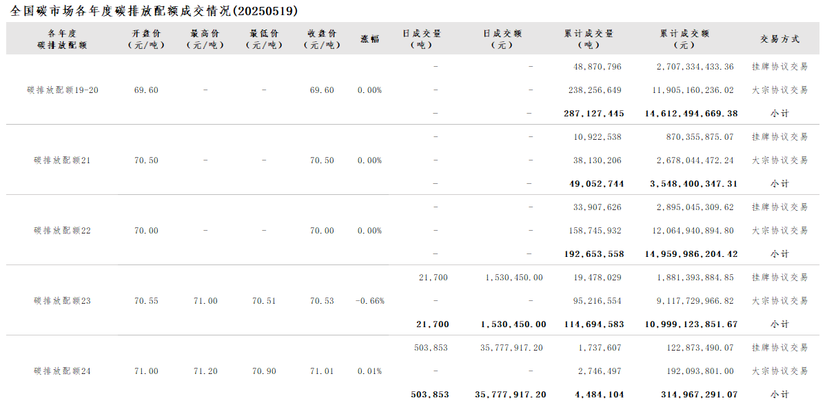 【CEA】全国碳市场每日综合价格行情及成交信息20250519