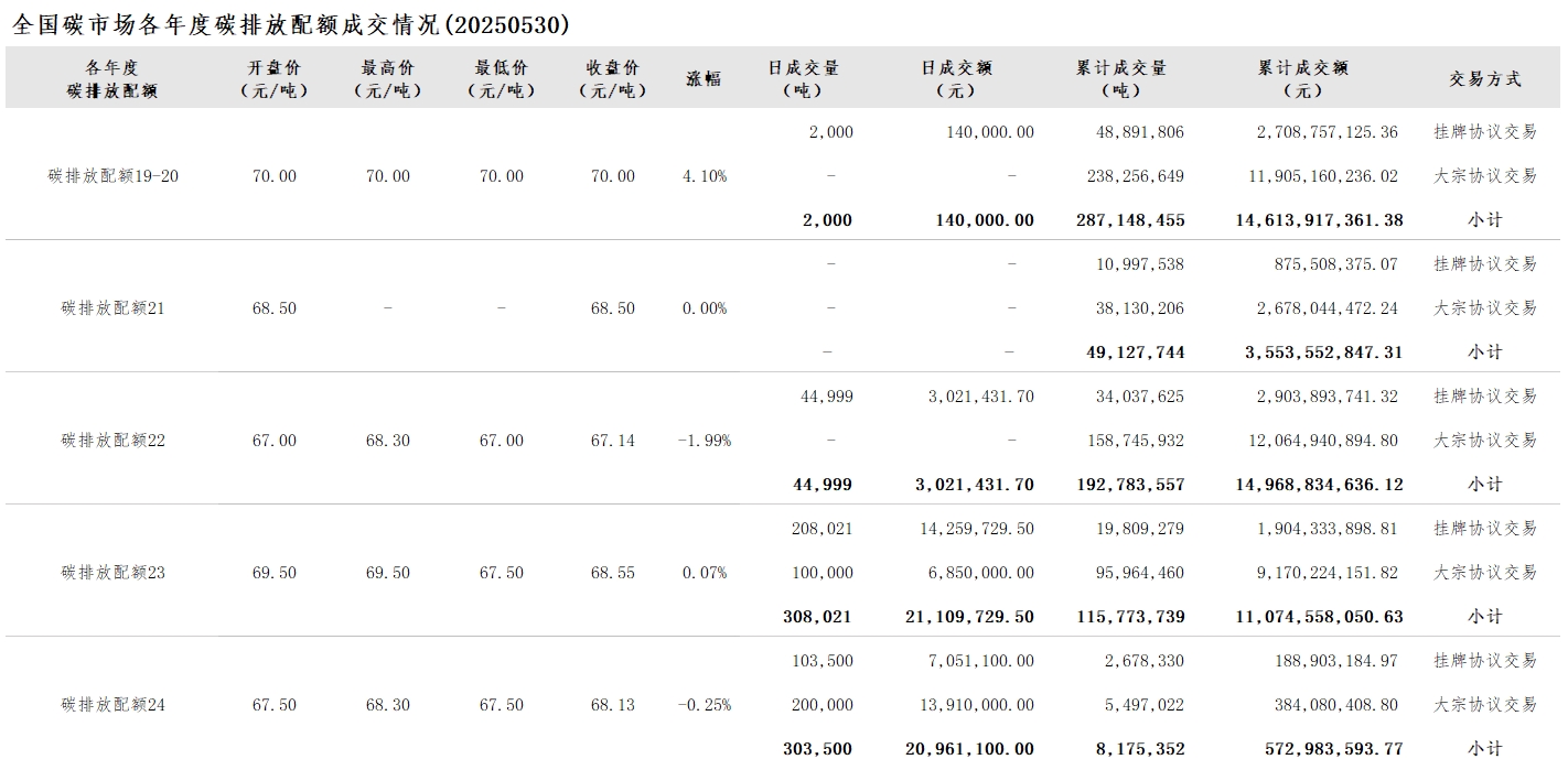 【CEA】全国碳市场每日综合价格行情及成交信息20250530