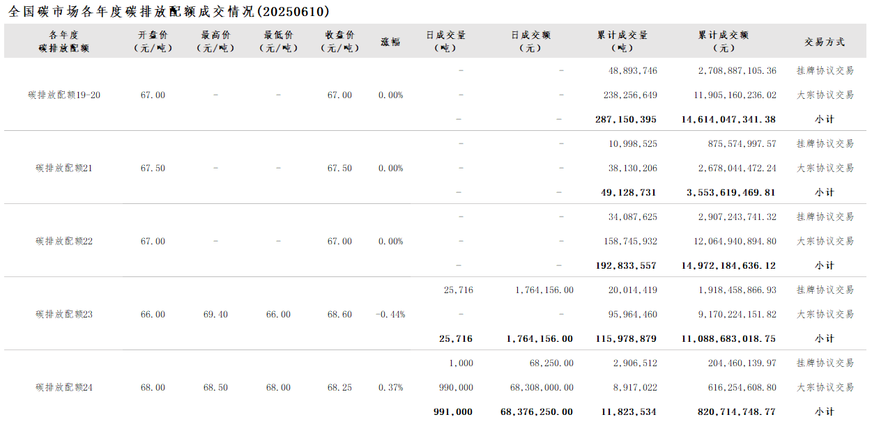 【CEA】全国碳市场每日综合价格行情及成交信息20250610