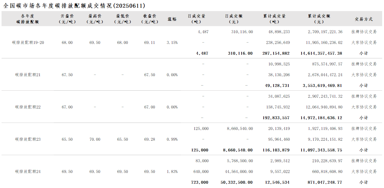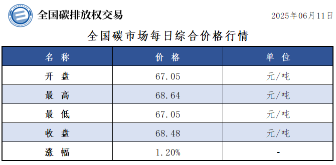 【CEA】全国碳市场每日综合价格行情及成交信息20250611