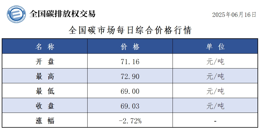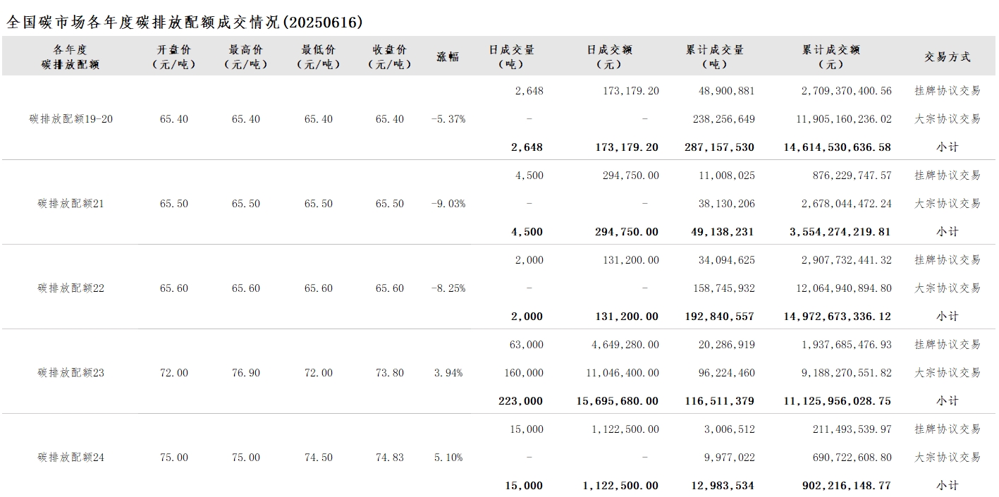 【CEA】全国碳市场每日综合价格行情及成交信息20250616