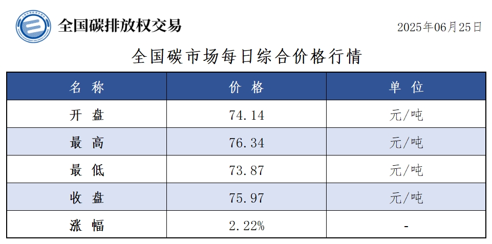 【CEA】全国碳市场每日综合价格行情及成交信息20250625