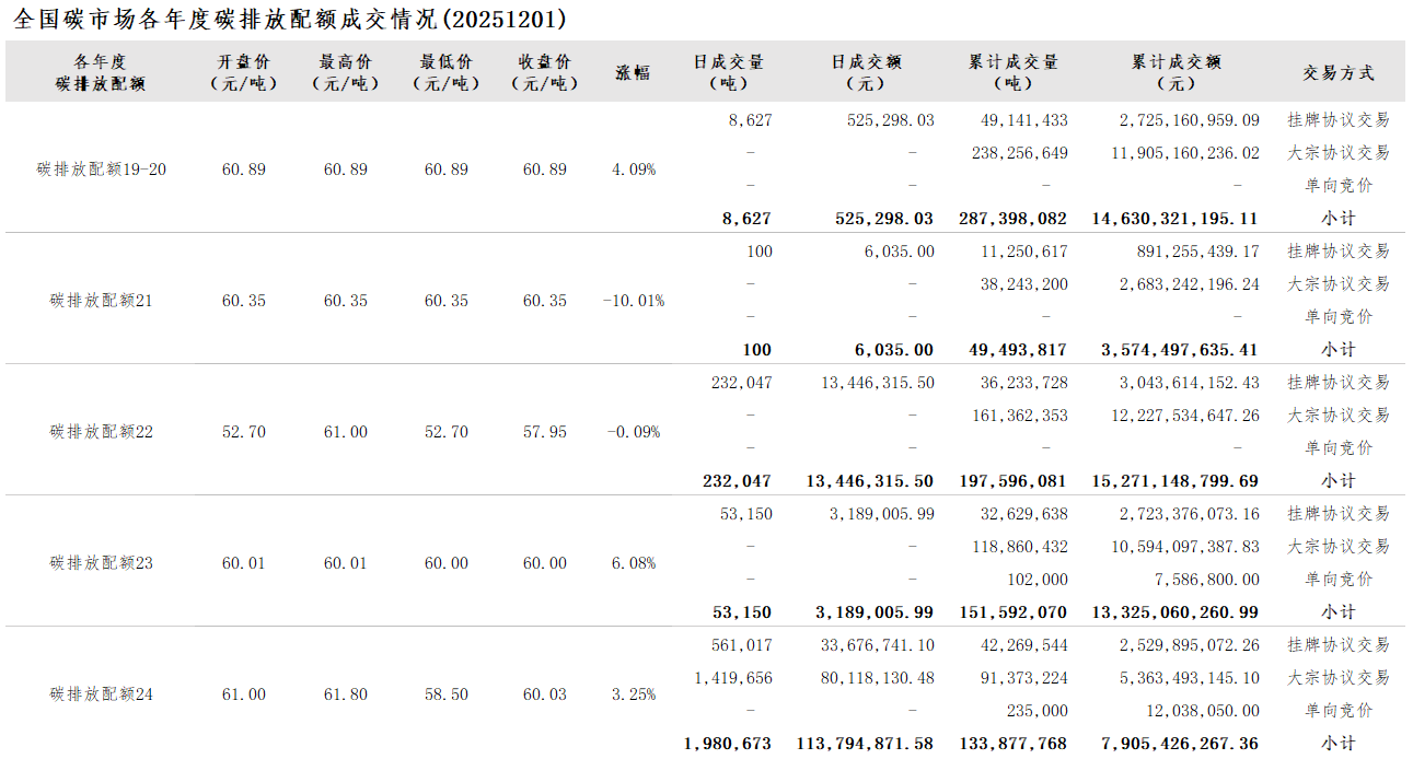 2025年1月1日至12月1日,全国碳市场碳排放配额成交量189,689,154吨,成交额11,673,727,055.05元。