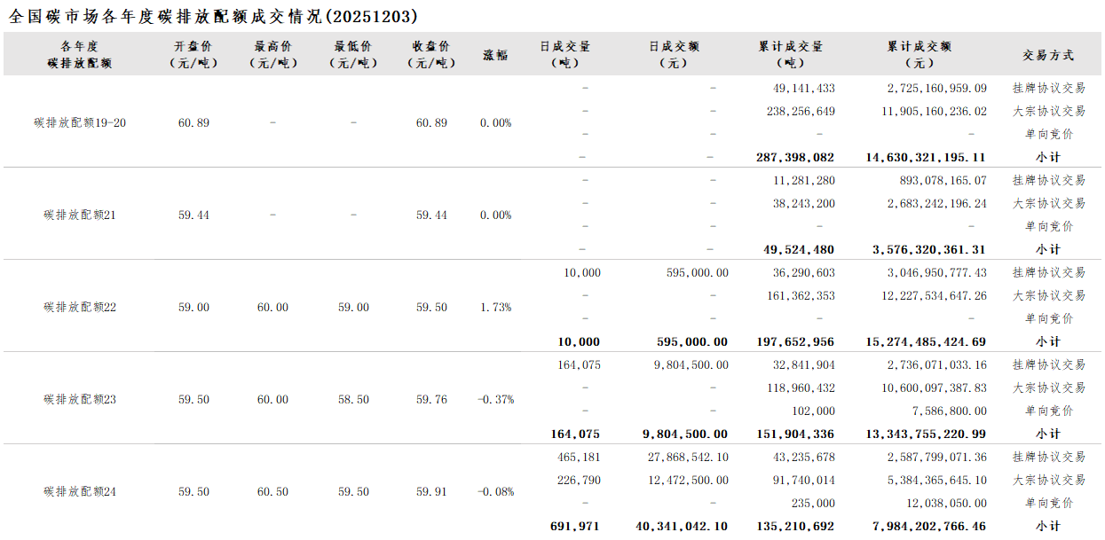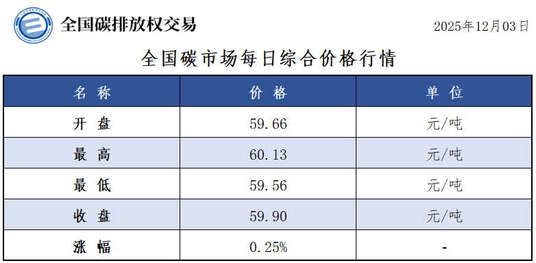 【CEA】全国碳市场每日综合价格行情及成交信息20251203