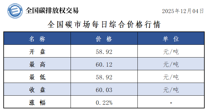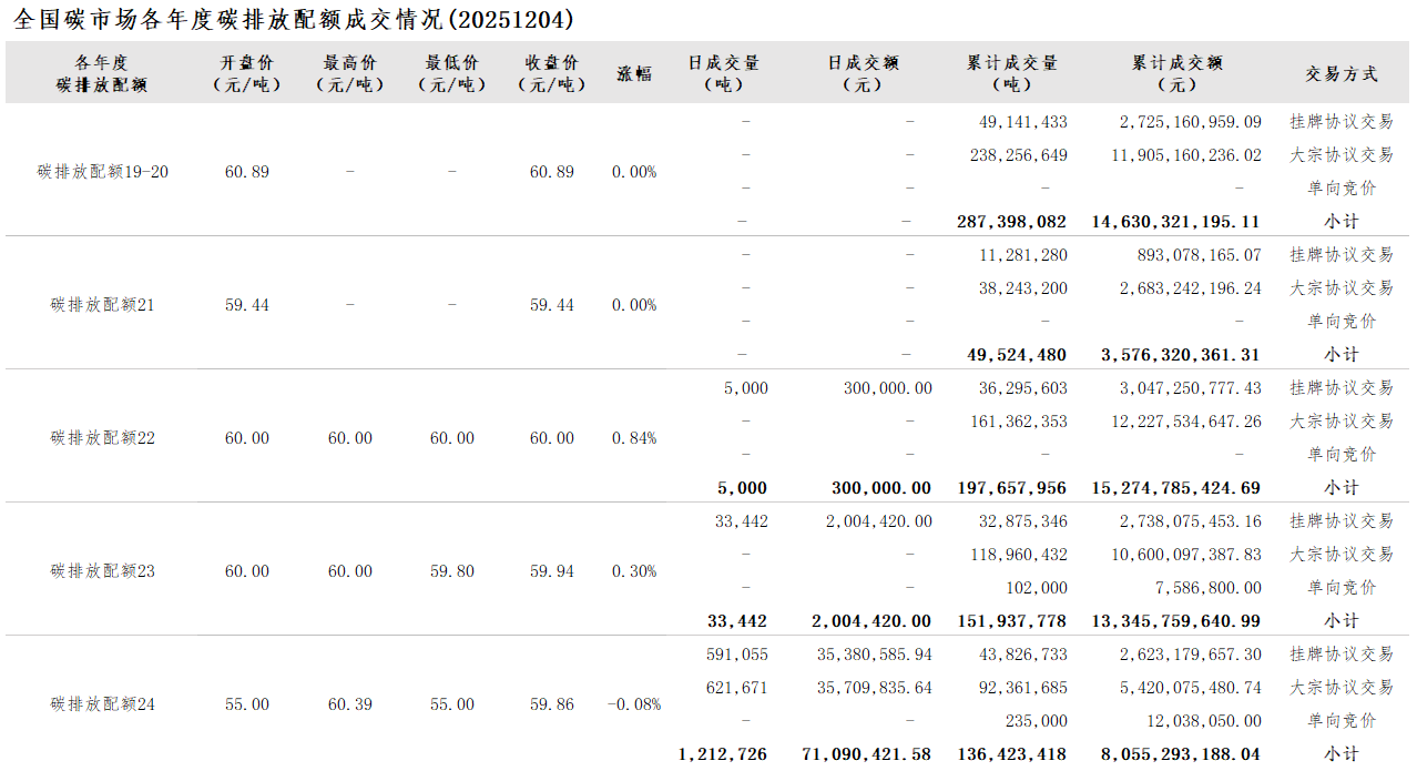 【CEA】全国碳市场每日综合价格行情及成交信息20251204