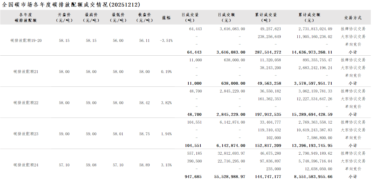 截至2025年12月12日,全国碳市场碳排放配额累计成交量832,554,451吨,累计成交额55,453,043,342.02元。