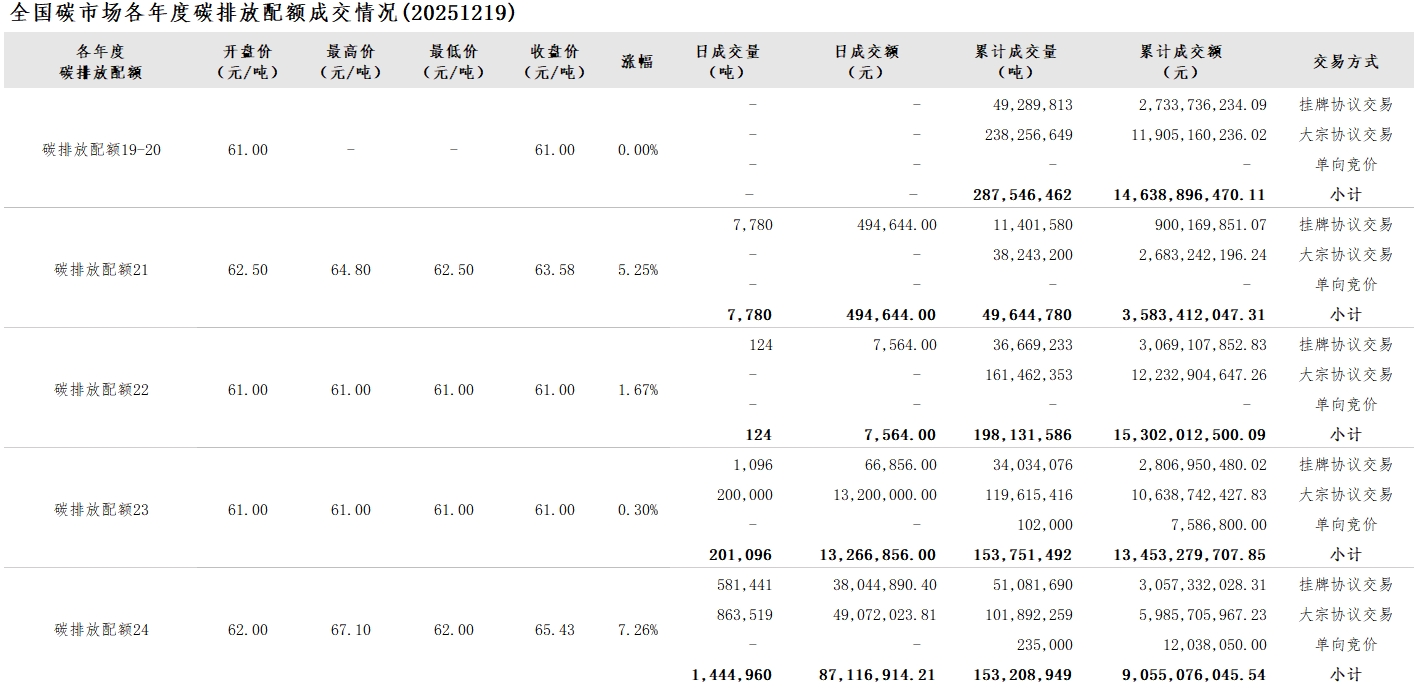 2025年1月1日至12月19日,全国碳市场碳排放配额成交量212,014,605吨,成交额12,999,949,667.39元。