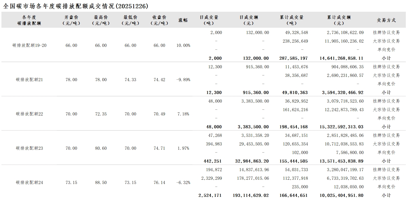 【CEA】全国碳市场每日综合价格行情及成交信息20251226